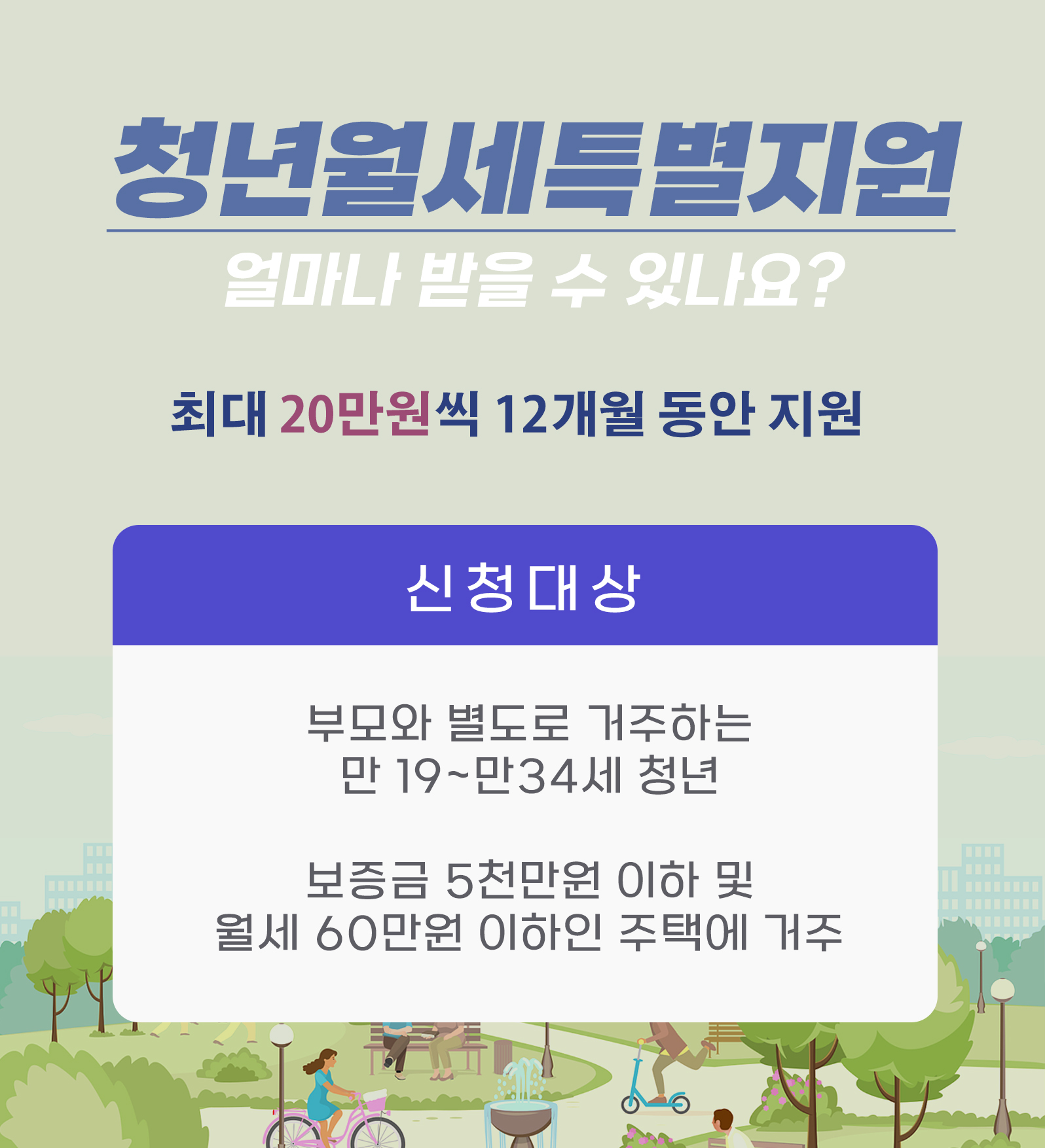 만 19세부터 만 34세 이하의 청년으로 부모님과 따로 거주하면서 보증금 5천만 원 의하, 월세 60만 원 이하의 주택에 거주하는 무주택자입니다.
