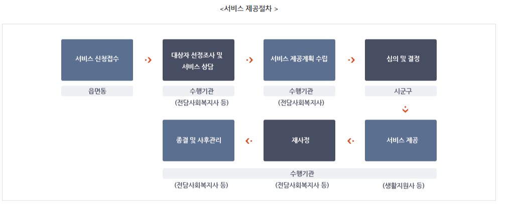 읍면동 주민센터(행정복지센터)에 신청서 접수 ⇨ 대상자 선정 조사 및 서비스 상담(수행기관) ⇨ 대상자 결정(시군구) ⇨ 서비스제공(수행기관)