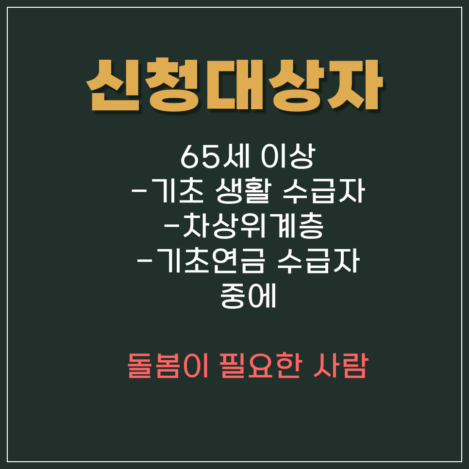 65세 이상의 기초 생활 수급자이거나 차상위계층 또는 기초연금 수급자 중 독거. 조손가구 등 돌봄이 필요한 사람입니다. 신청 대상자 중 선정도구를 통해 우선순위에 따라 선정합니다.