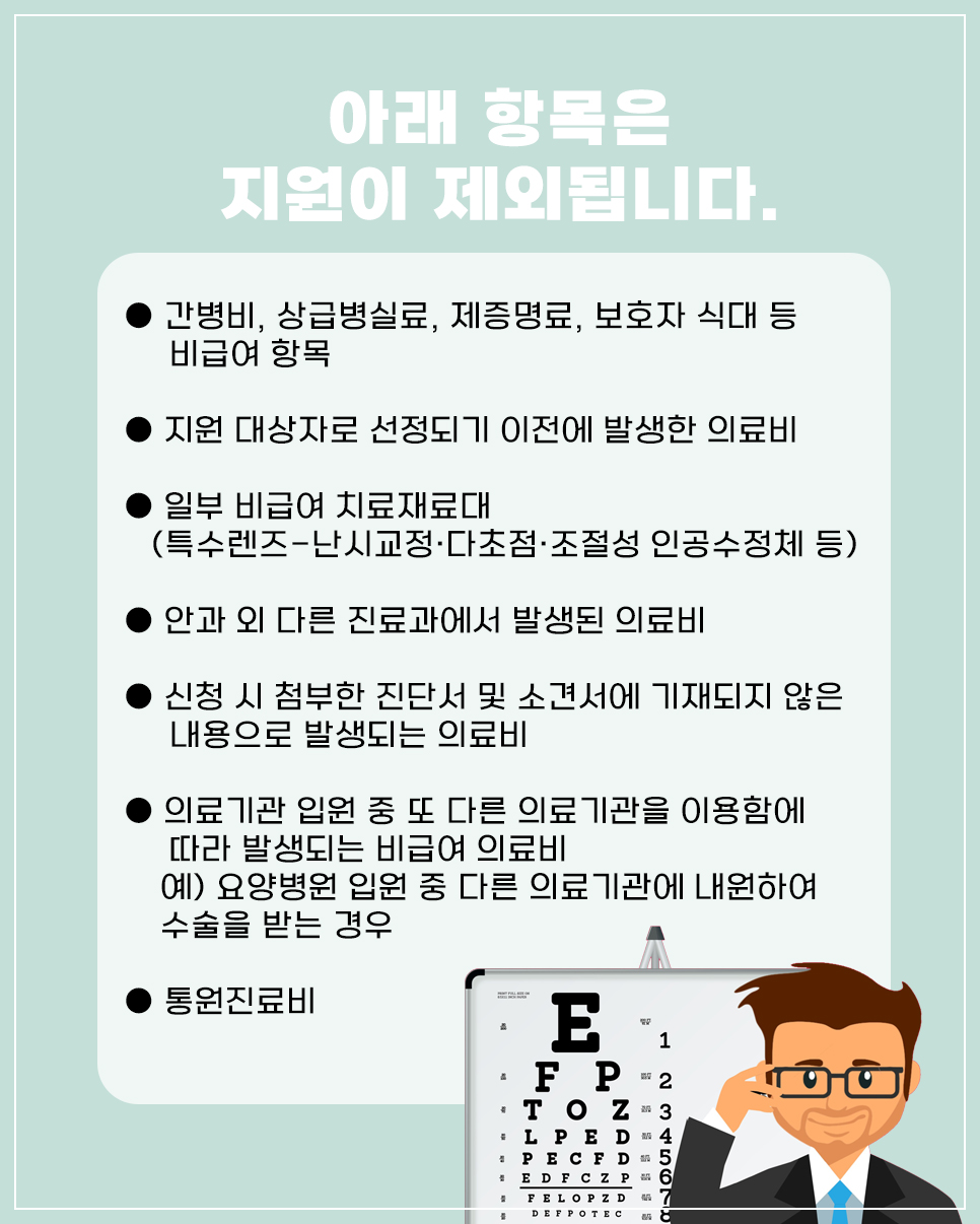 개안수술과 관련 없는질병 치료비, 간병비, 상급병실료 등 비급여 항목은 지원받으실 수 없습니다.
