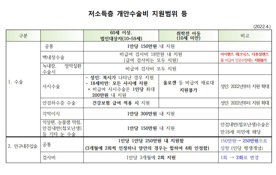 국민기초생활보장법에 따라 만 60세 이상의 저소득층 어르신을 대상으로 백내장 수술비, 사시수술, 각막이식, 안구내주입술 등 다양한 눈 수술비를 지원하고 있어요.