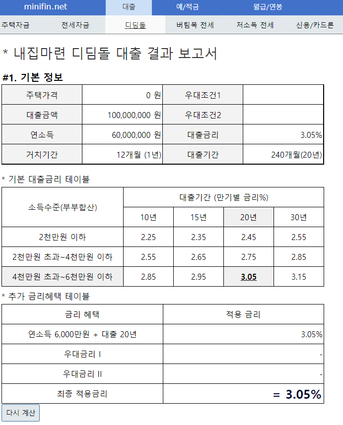 예를 들어 대출금액 1억 / 부부합산 연소득 6천만원 / 대출기간 20년 / 거치기간 12개월(최대) 라고 하면 최종 금리는 3.05% 가 나옵니다. 여기에 다자녀, 다문화, 생애최초주택 등의 혜택을 적용했을 때 금리의 변화를 계산해 볼 수 있습니다. 간단한 방법으로 대출 기간별 금리를 알아보실 수 있어서 궁금증해결에 도움이 될거같아요.