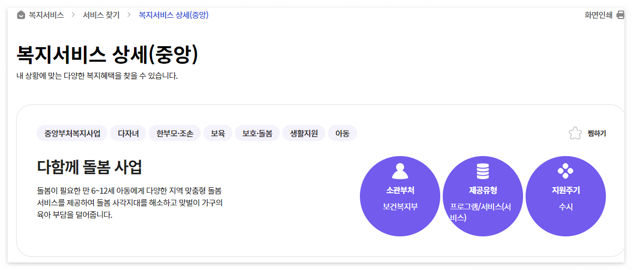 저는 초등학생의 자녀 2명이 있어서 영유아나 다자녀의 혜택은 받아 볼 수 었었어요. 제가 받을 수 있는 복지서비스는 다함께 돌봄 사업이었는데요. 다함께 돌봄 사업은 만6세에서 만12세까지 아동을 지원하며 지자체의 여건에 따라 우선 대상자를 선정하여 신청이 가능하다고 해요.