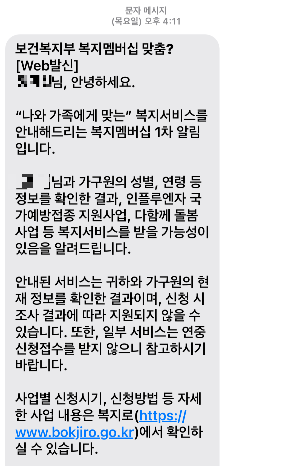 저는 지난번에 신청했던 안내 서비스에서 문자가 위처럼 왔더라고요. 성별과 연령, 가구원을 확인하고 받을 가능성이 있는 복지 서비스를 1차로 문자 수신 받았어요.