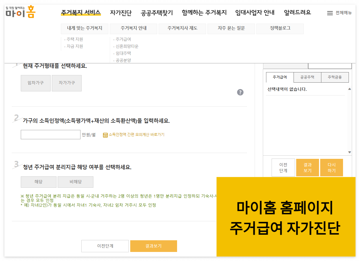 위에서 소득인정액을 계산하셨다면 마이홈 홈페이지에 들어가셔서 주거복지 서비스 메뉴 내에 자가진단을 진행해보실 수도 있는데요.